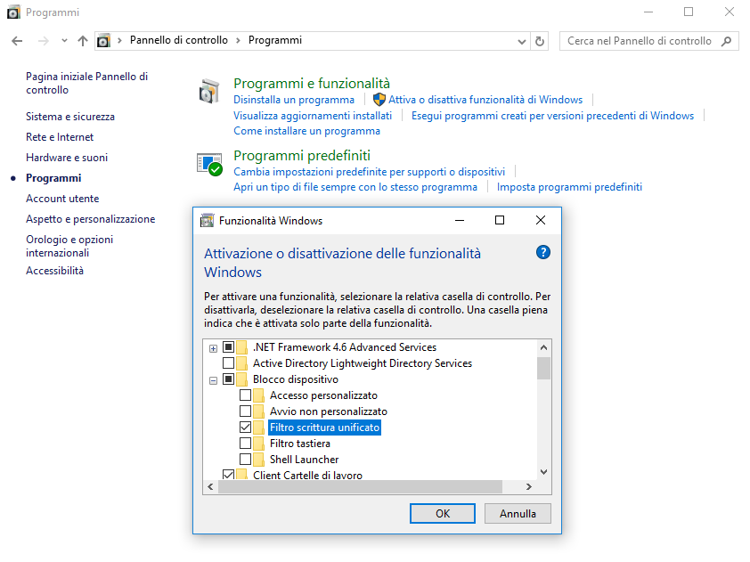 Per poter utilizzare UWF con Windows 10 Enterprise è necessario abilitarlo nel pannello di controllo. Aprite il Pannello di controllo con Windows+X, scegliete ‘Programmi’ e lanciate ‘Attiva o disattiva le funzionalità di Windows’. Aprite la cartella ‘Blocco Dispositivo’ e selezionate ‘Filtro scrittura unificato’. Dopo il riavvio della macchina sarete pronti per configurare il filtro.