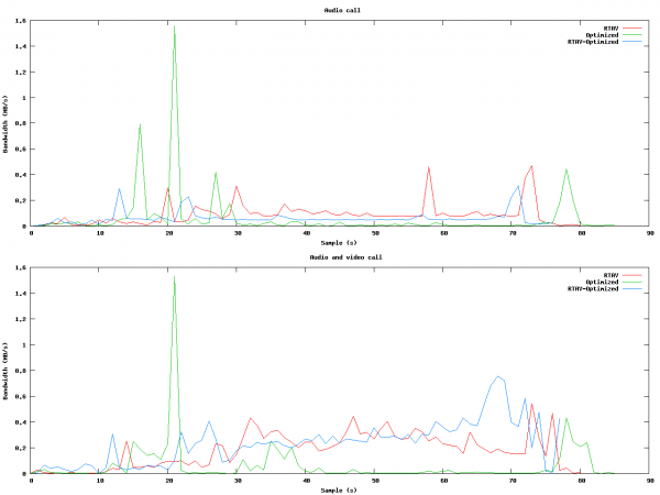 Nei due grafici è rappresentata la banda utilizzata dal bridge durante una chiamata solo audio e una videochiamata. Le linee invece rappresentano la chiamata attraverso due client che sfruttano l’ottimizzazione, due client senza ottimizzazione, e il setup misto con un client ottimizzato e l’altro no.